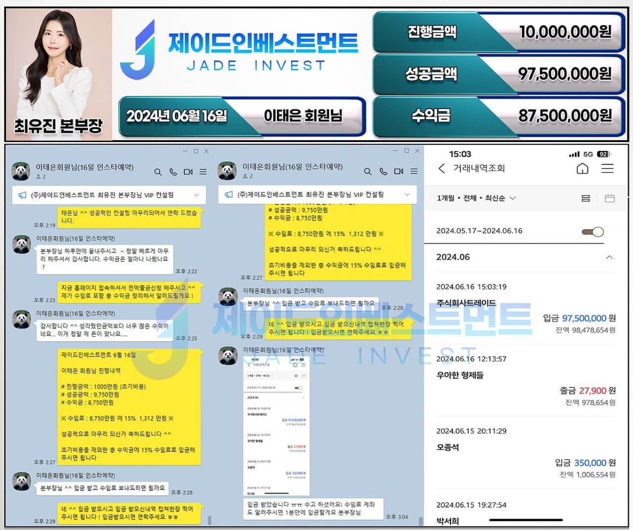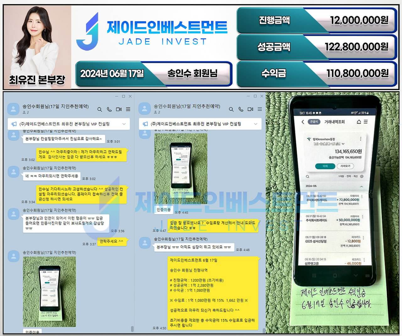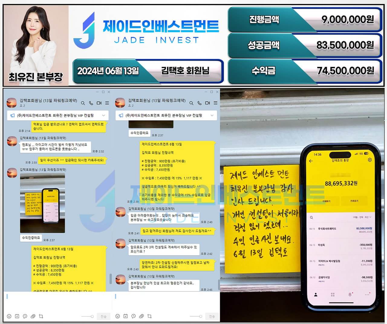 안녕하세요 (주)제이드인베스트먼트 최유진 본부장님 ~!!! 얼마전에 유진님 통해서 받은 리딩이 너무 잘되서 너무 행복하고 꿈만같습니다 항상 많은도움주신거에 비해 제 인사가 너무 초라할수있지만 제 마음만은 정말 크니 좋게봐주셨으면 좋겠어요 ㅎㅎ