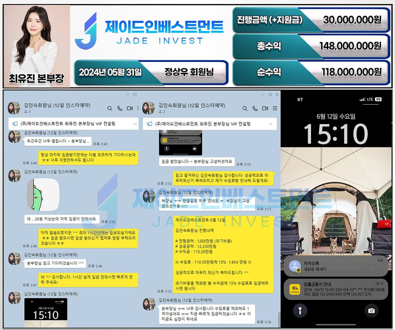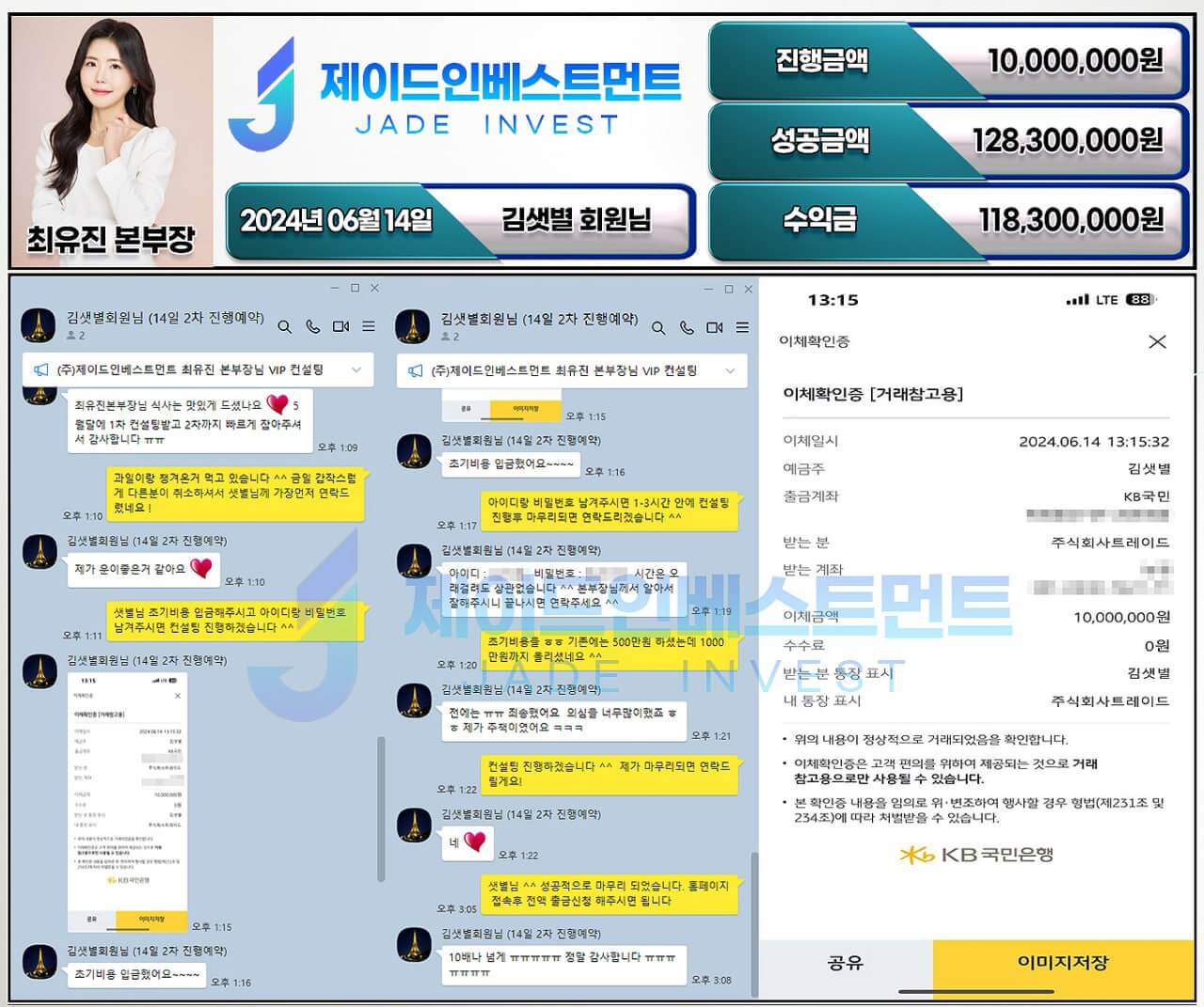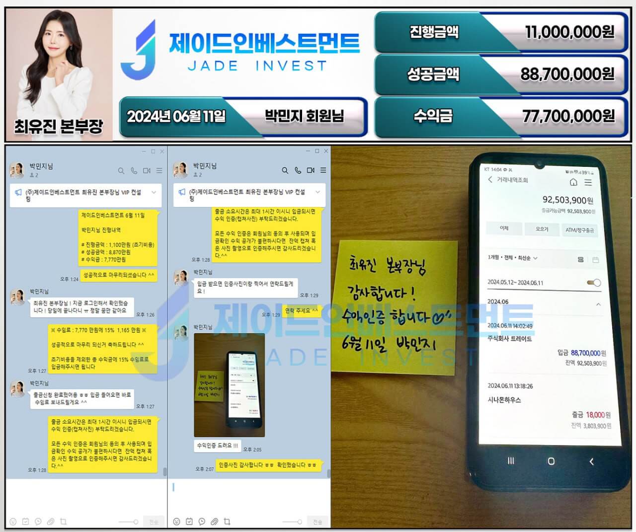 안녕하세요 (주)제이드인베스트먼트 최유진 본부장님 ~!!! 얼마전에 유진님 통해서 받은 리딩이 너무 잘되서 너무 행복하고 꿈만같습니다 항상 많은도움주신거에 비해 제 인사가 너무 초라할수있지만 제 마음만은 정말 크니 좋게봐주셨으면 좋겠어요 ㅎㅎ